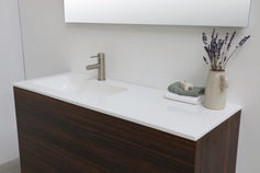 The Faktor range is our approach to grandeur and space. The new, slender INK Faktor range offers modern and spacious polystone washbasins with widths ranging up to an impressive 160 cm. If you are in favour of ample storage space and ease of use, this is your ideal bathroom furniture. You can opt for a large side plateau or an extra-large basin. An infinity of choices awaits you. This washbasin, with its ultra-modern bowl, already brings a familiar feeling to the INK collection. You can choose from gloss white or mat white finish. This washbasin can also be ideally combined with all washbasin cabinet from the INK range. Furthermore, the Faktor washbasin is also a perfect match for the new push-to-open washbasin cabinet.